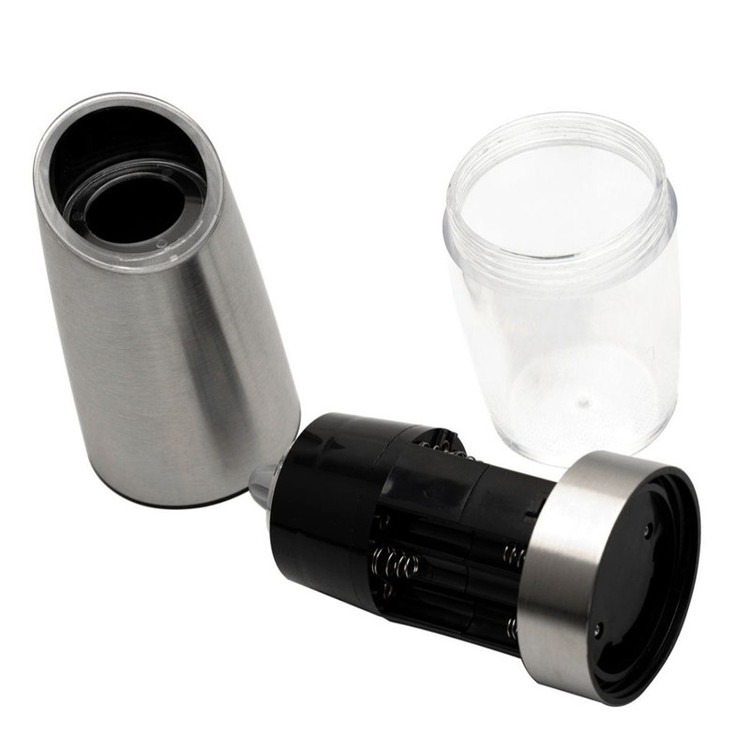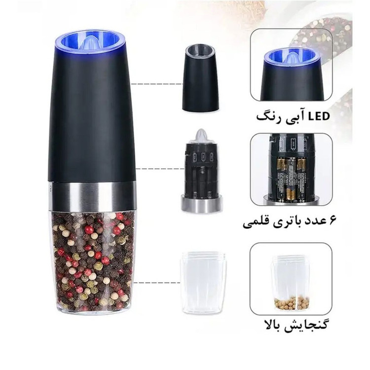 【عملکرد خودکار】 فلفل ساب و نمک ساب برقی ، با توجه به داشتن سنسور جاذبه شما می توانید دستگاه را برگردانید و بدون نیاز به فشردن دکمه نمک و ادویه های آسیاب شده و تازه داشته باشید. ، هر دستگاه آسیاب به 6 باتری قلمی نیاز دارد. (باتری ها شامل دستگاه نمی باشند) 【 آسیاب قابل تنظیم】 این دستگاه به شما این امکان را می دهد که ریزی و درشتی ادویه را انتخاب کنید. فلفل ساب و نمک ساب برقی ازخردکن سرامیکی با کیفیت بالا استفاده می کند. ریزی و درشتی ادویه خود را می توانید با چرخاندن دکمه تنظیم در سر آسیاب انتخاب کنید. 【کاربرد گسترده】 آسیاب برقی برای فلفل، نمک و سایر چاشنی های دانه جامد مناسب است و راحت و سریع شما می توانید آن را در هر زمان و هر مکان استفاده کنید. این آسیاب کمک خوبی برای آشپزخانه، رستوران، مهمانی و پیک نیک در فضای باز است. 【طراحی منحصر به فرد】ظرف شیشه ای این محصول این امکان را به شما می دهد که از ظرفیت باقیمانده ادویه خود آگاه باشید و در هنگام استفاده از آن نور آبی ملایمی از انتهای دستگاه ساطع می شود.