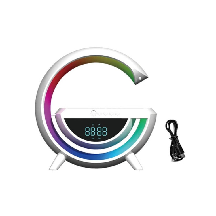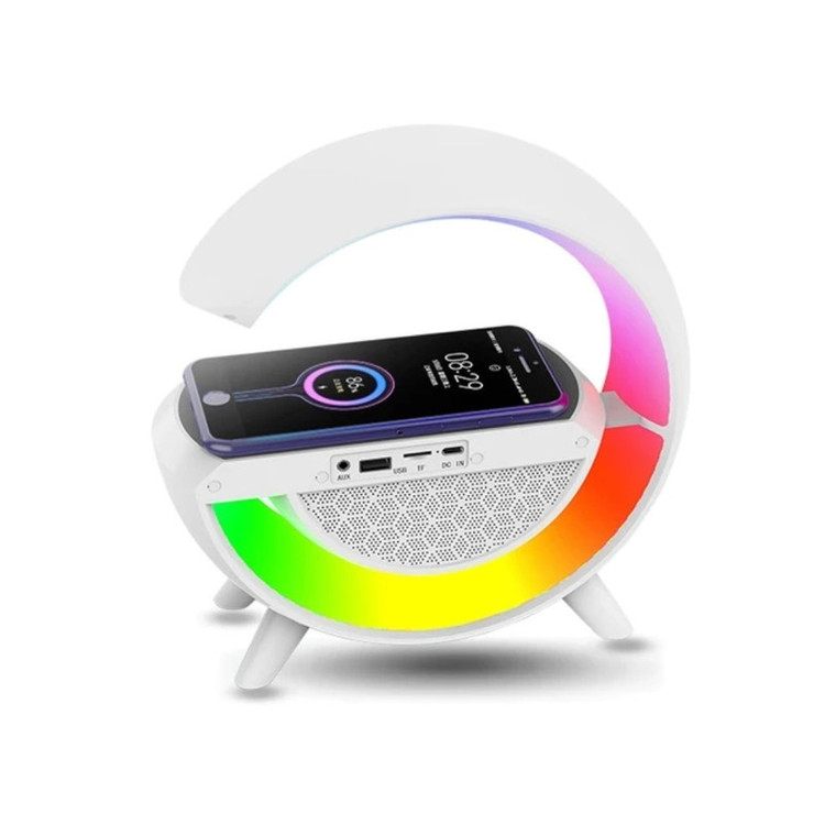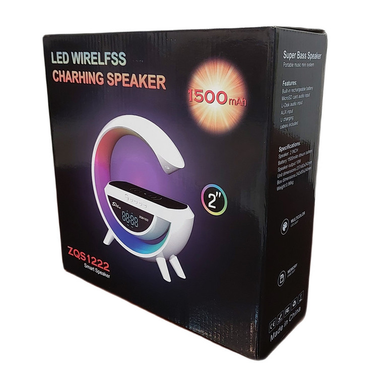 توان خروجی اسپیکر 10وات باتری 1500 میلی آمپر اسپیکر وایرلس سوپر باس رادیو FM ساعت دیجیتال هوشمند با صفحه 2 اینچ نورپردازی جذاب قابل تنظیم RGB اتصال از طریق بلوتوث ,USB,کارت حافظه و AUX شارژ وایرلس برای گوشیهای دارای این قابلیت
