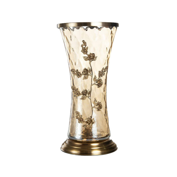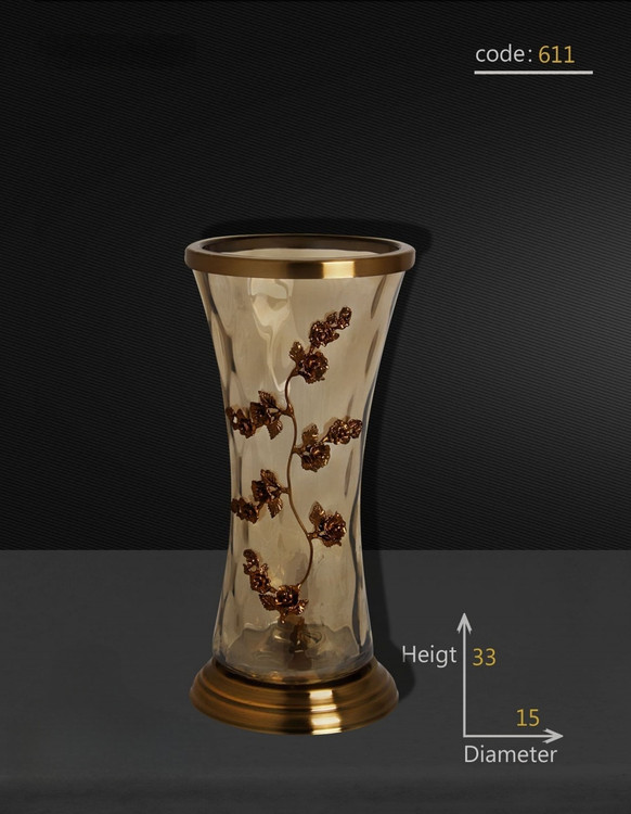 جنس این گلدان شیشه میباشد که با گل های زیبا وظریف از جنس بفلز آبکاری کار شده است قابل استفاده هم برای گل طبیعی و هم برای گل مصنوعی میباشد بسیار کار ظریف و زیبایی میباشد و جنس بدنه از بهترین کیفیت میباشد