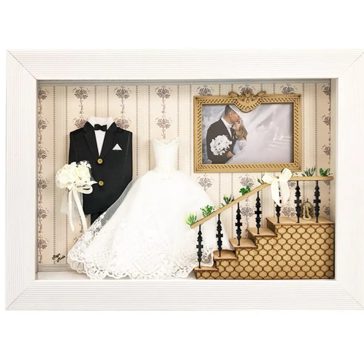 تابلو سه بعدی طرح عروس با قاب سفید pvc و ساخته شده با چوب و پلاستیک بسیار تمیز وشیک دارای تک جعبه کادویی